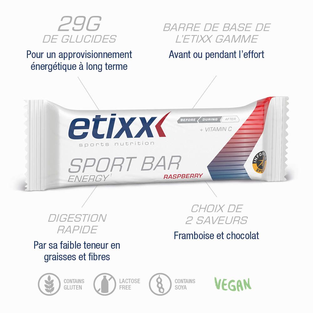 Ces barres énergétiques se prêtent tant à une consommation avant et au cours de l’exercice. Avant l’exercice, le corps d’un sportif doit contenir un taux aussi élevé que possible d’hydrates de carbone. À cette fin, il doit consommer des aliments riches en hydrates de carbone les jours qui précèdent la compétition ou l’entraînement lourd (= recharge en hydrates de carbone) et prendre un repas riche en hydrates de carbone 1 heure et demie à 4 heures avant la compétition. Etixx Energy bar peut servir d’en-cas les jours qui précèdent la compétition et pendant ou peu après le repas préalable à la compétition.