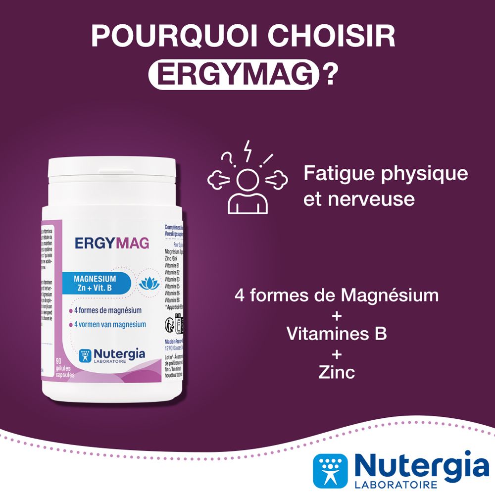 Nutergia ErgyMag : Magnésium + Zinc associe du magnésium à des vitamines B, cofacteurs indispensables, et du zinc, qui soutient l’équilibre acidobasique.