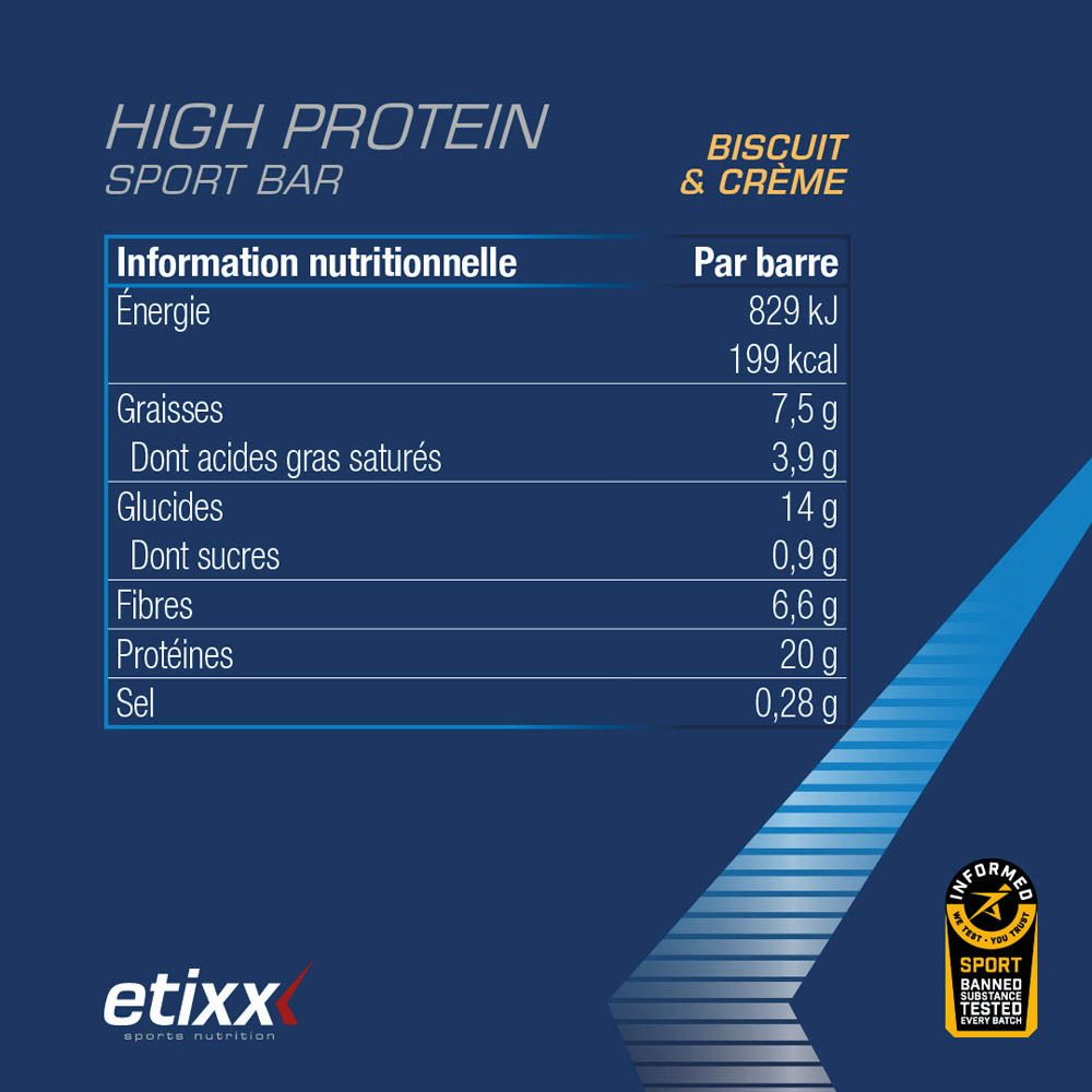 Mélange de protéines (Hydrolysat de gélatine, protéines de lait, isolat de protéines de lactosérum (lait), isolat de protéines de soja - Chocolat 20 % (sucre, pâte de cacao, beurre de cacao, émulsifiant : lécithine de soja) - Humectant : Glycérol - Sirop de glucose - Oligofructose - Noix de coco 2,7 % - Arômes - Cacao en masse - Émulsifiant: lécithine de soja.