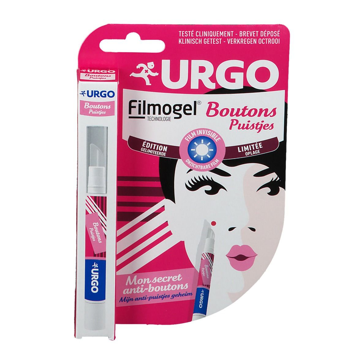 Le Filmogel URGO Boutons à base d'acide salicylique et d'huile essentielle d'arbre à thé forme un film invisible et confirmable qui accèle la disparition du bouton sans irriter la peau, limite le tripotage du bouton, atténue le risque de marques et permet le maquillage.