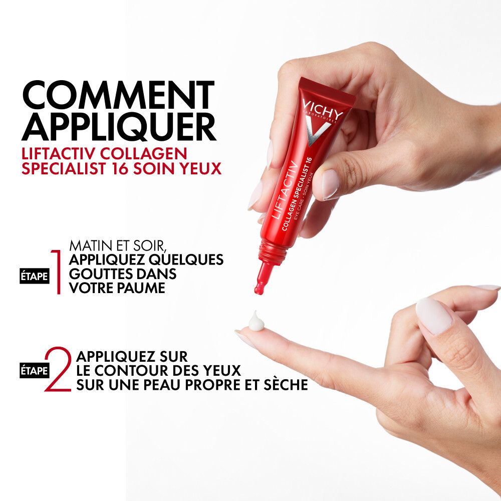 Avec l'âge, la production de collagène commence à diminuer, ce qui accélère les signes du vieillissement cutané, en particulier autour des yeux. Les experts de Vichy ont conçu le soin Liftactiv Collagen Specialist 16 Eye pour combattre les 16 signes du vieillissement cutané grâce à la Co-Bonding Technology* : poches, cernes, rides sous les yeux, pattes d'oie, ridules, fermeté, relâchement, souplesse, grain de peau, signes de fatigue, tonicité, résilience, éclat, élasticité, hydratation, uniformité.