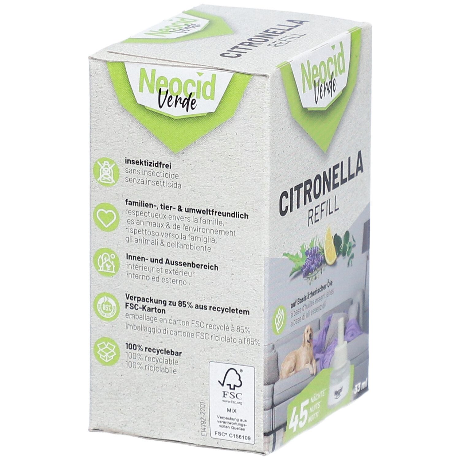 La recharge Neocid Verde Citronnelle de 33 ml contient de l’huile naturelle de citronnelle et sert de recharge pour les diffuseurs ou autres usages extérieurs. Elle permet de repousser efficacement les moustiques et autres insectes, tout en diffusant un parfum agréable.