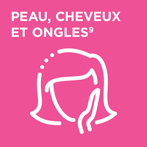 ¹La vitamine C contribue à un métabolisme énergétique normal. ²L’acide folique contribue à une fonction psychologique normale, comme il contribue à la résistance au stress. ³La vitamine D contribue au fonctionnement normal du système immunitaire. ⁴La vitamine B6 aide à réguler l’activité hormonale. ⁵Le fer, l’iode et le zinc contribuent à une fonction cognitive normale. ⁶Le calcium, le magnésium et la vitamine D contribuent au maintien d'une fonction musculaire normale. ⁷Le calcium et les vitamines D et K, contribuent au maintien d’os solides. ⁸L’acide folique contribue à une fonction psychologique normale et est bon pour l'humeur. ⁹Le zinc contribue au maintien d’une peau, de cheveux et d’ongles sains.