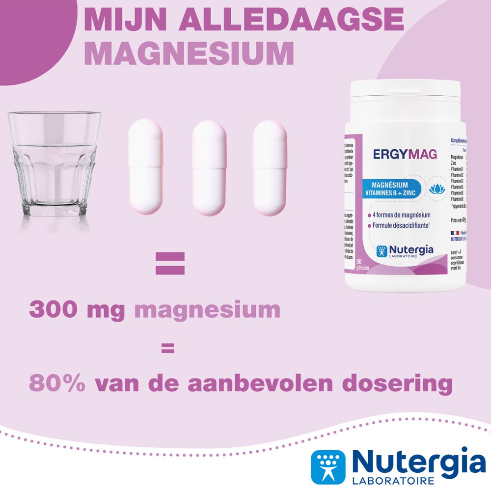 Nutergia ErgyMag : Magnesium + Zink combineert magnesium met vitaminen uit de B-groep en zink, dat het zuur-base-evenwicht ondersteunt. De formule heeft 2 functies: aanvoer van magnesium en het zuur-base evenwicht ondersteunen dankzij zink.