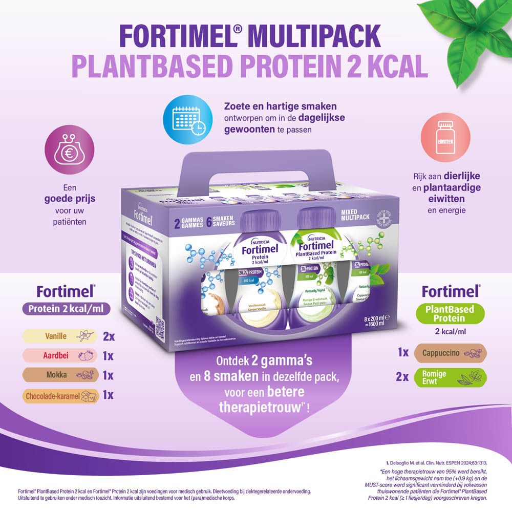 Fortimel Multipack Protein PlantBased 2 Kcal bestaat uit 5 flesjes Fortimel Protein 2 Kcal en 3 flesjes Fortimel PlantBased Protein 2 Kcal.